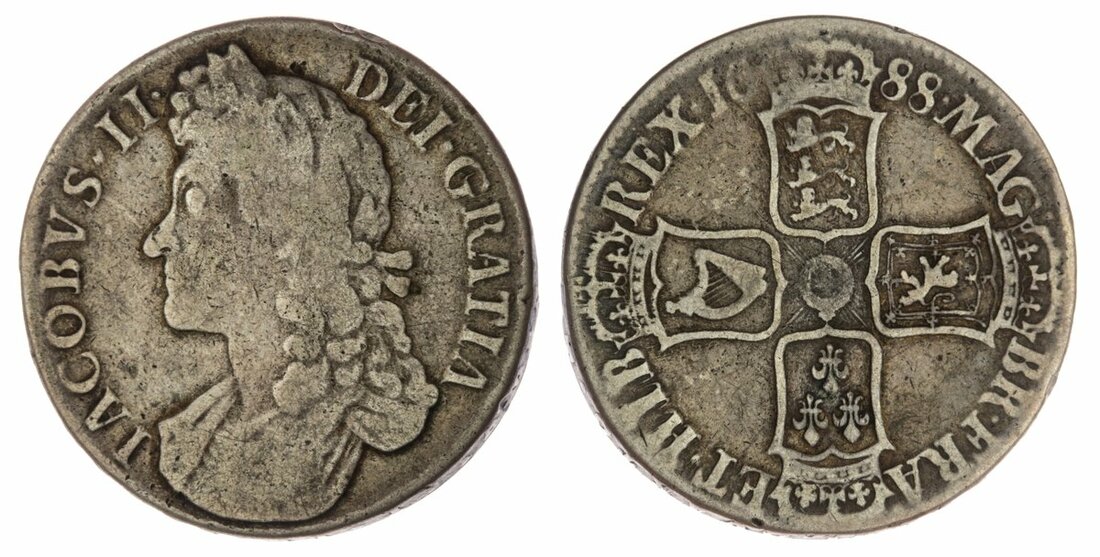 James II (1685-1688), Crown, 1688 QVARTO, second bust, six strings, edge lettered upwards, 28.67g, 6h (Bull 746; ESC 80; Pywell-Phillips 118; Spink 3407), fair / almost fine