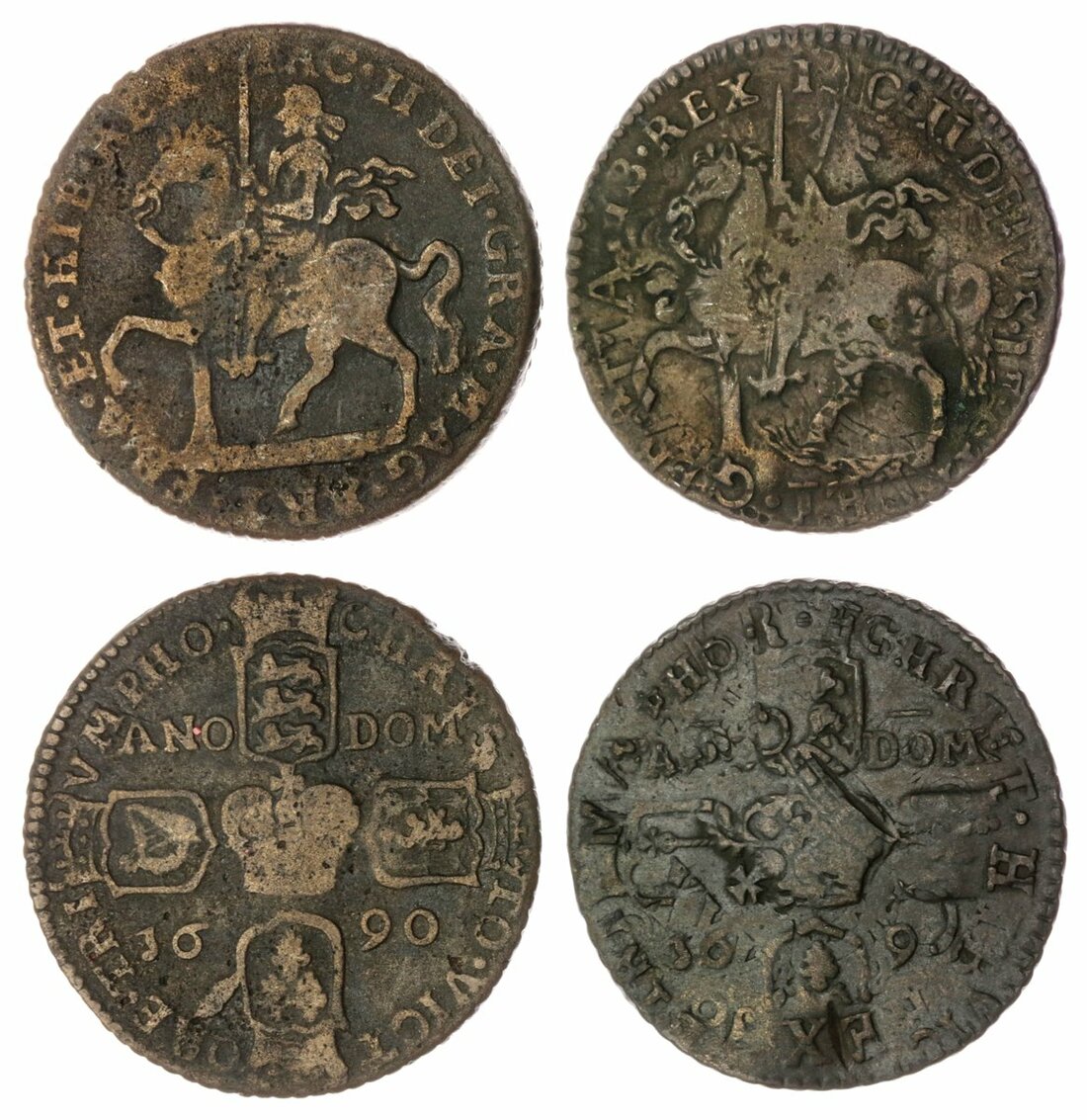 Irish Civil War (1689-1691), James II, 'Gunmoney', Crowns, 1690, Dublin (2), legend splits VICT | ORE, straight shields, 11.74g, 11h; 14.39g, 11h (Spink 6578), the first with much trace of undertype including the October 1689 date extant, but crimped and dented otherwise a bolder fine, the other struck on a virgin flan, fair (2)