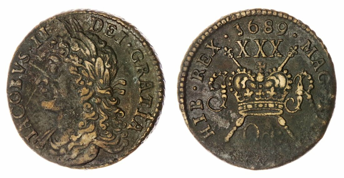 Irish Civil War (1689-1691), James II, 'Gunmoney', Halfcrown, October 1689, 14.76g, 12h (Spink 6579D), softness of strike to reverse 6 o'clock, otherwise a bolder very fine
