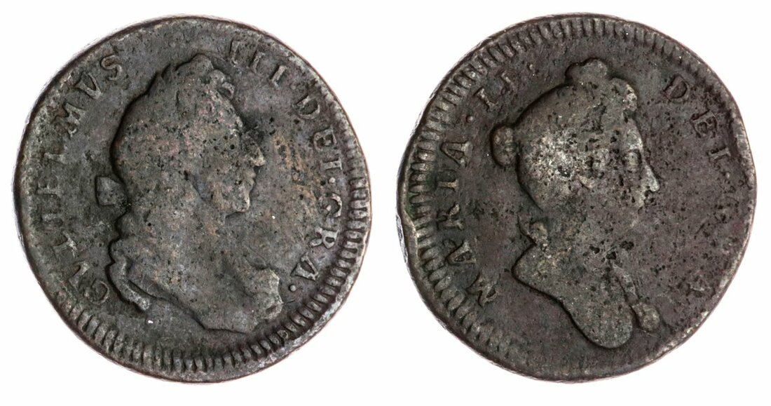 The Abramson Collection of English Coins | William and Mary (1688-1694), Pattern Farthing or Medallet, GVLIELMVS III DEI GRA, in copper, laureate bust right, rev. MARIA II DEI GRA, bust right, edge plain, 5.93g, 12h (MI I, 691/81; Montagu 15), slightly porous and rim stipled, otherwise fair