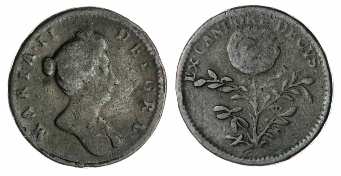 The Abramson Collection of English Coins | William and Mary (1688-1694), Pattern Farthing or Medallet, in copper, MARIA II DEI GRA, bust right, rev. EX CANDORE DECVS, rose, edge plain, 5.70g, 11h (MI I, 695/93), fair, scarce