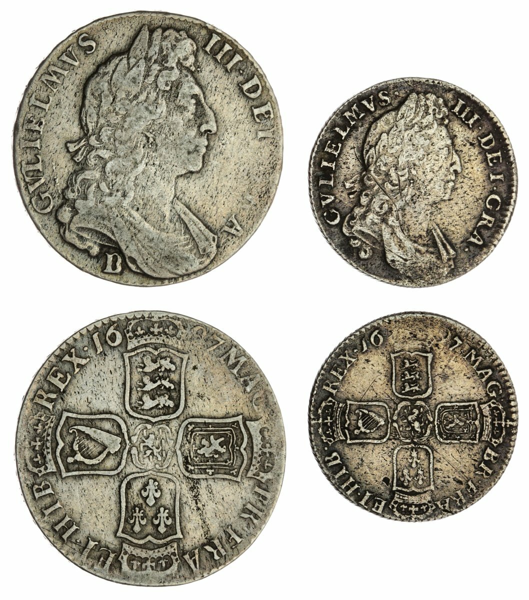 William III (1694-1702), Halfcrown, 1697-B NONO, Bristol, possibly B over y [?], large shields, six strings to late harp, 14,53g, 7h (Bull 1060; ESC 543; Spink 3488); also, Shilling, 1697, London, first bust, with ties, six strings to intermediate harp, small lions, 5.90g, 7h (Bull 1117; ESC 1091; Spink 3497), porous and scruffy, otherwise a bolder fine (2)