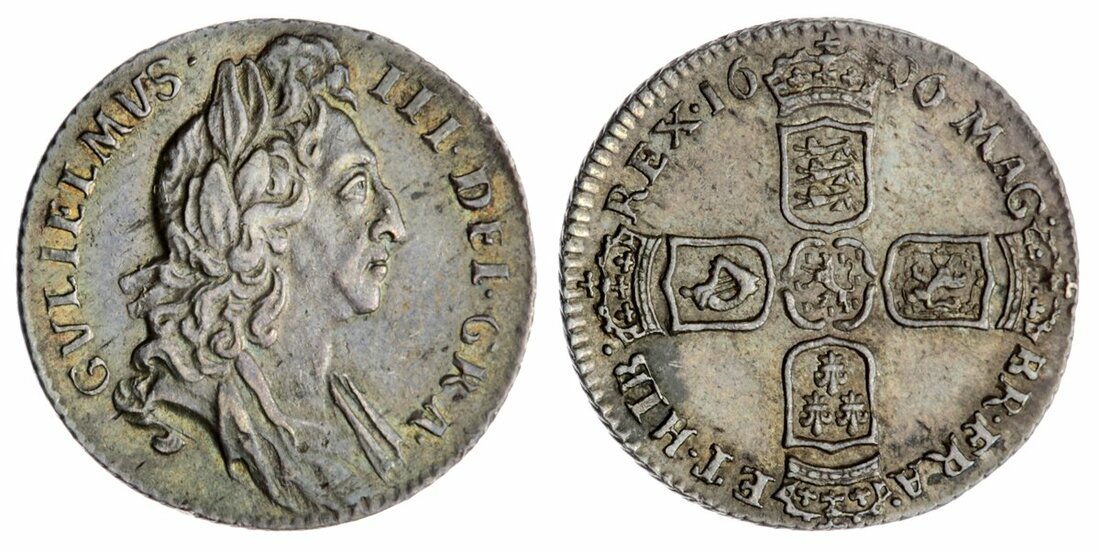 The Abramson Collection of English Coins | William III (1694-1702), Sixpence, 1696, first bust, rev. crowned shields cruciform, three strings to harp, eight billets, edge obliquely milled, 2.99g, 6h (Bull 1202; ESC 1533; Spink 3520), handsomely toned, near extremely fine