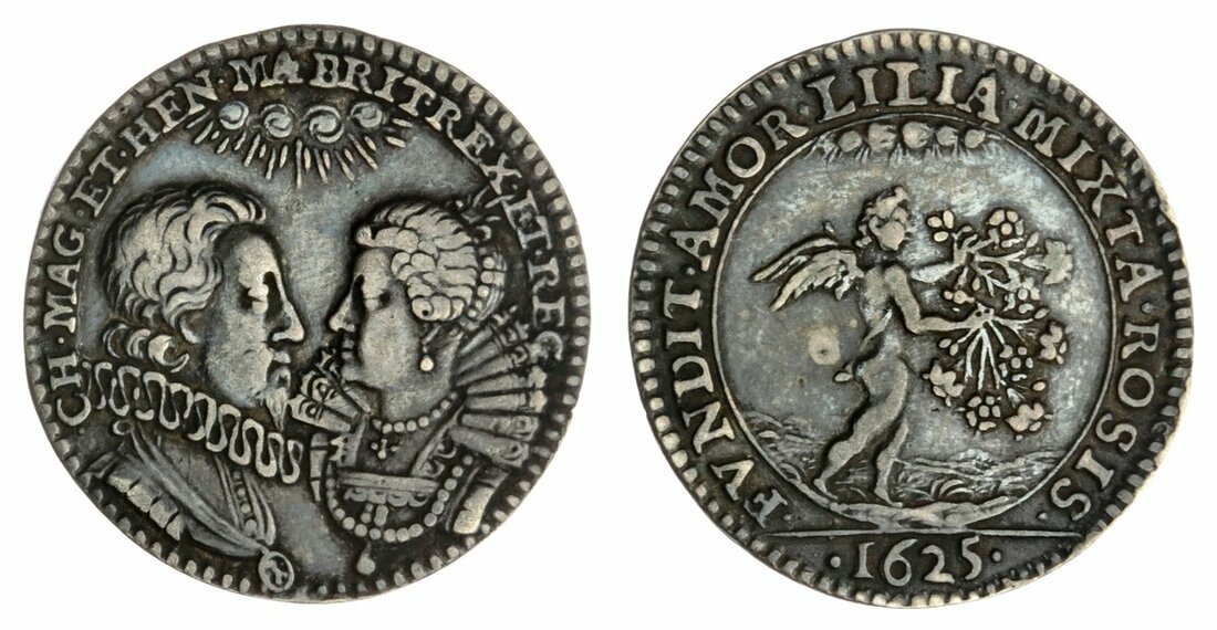Marriage of Charles I to Henrietta Maria, 1625, Cast AR Medallet, by P. Regnier, CH. MAG. ET. HEN. MA. BRIT. REX. ET. REG, busts face to face, celestial rays above, rev. FVNDIT. AMOR. LILIA. MIXTA. ROSIS., Cupid walking, scattering roses and lilies, celestial rays above, 1625 in exergue, 2.01g, 23mm. (Eimer 105A; MI 238/1), some historic smoothing in reverse fields, otherwise toned, very fine