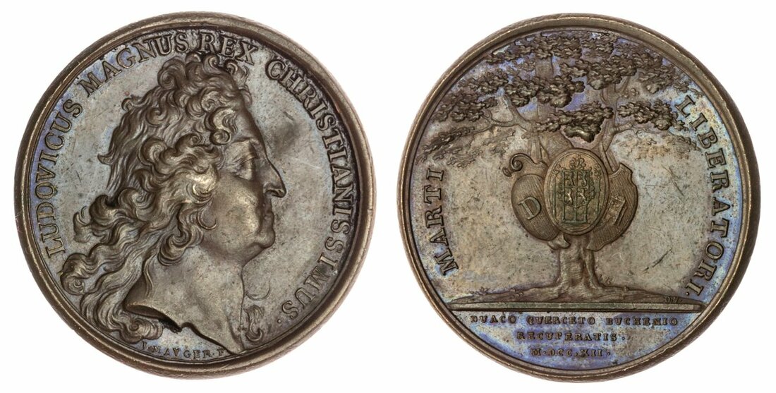 France, Louis XIV (1643-1715), Capture of Douai, Quesnoy and Bouchain, 1712, AE medal, by Mauger, LUDOVICUS MAGNUS REX CHRISTIANISSIMUS., bust right, rev. MARTI LIBERATORI, the shields of the three cities hanging from an oak tree, DUACO QUERCEtO BUCHEMIO RECUPERATIS M.DCC.XII in exergue in three lines, 41mm