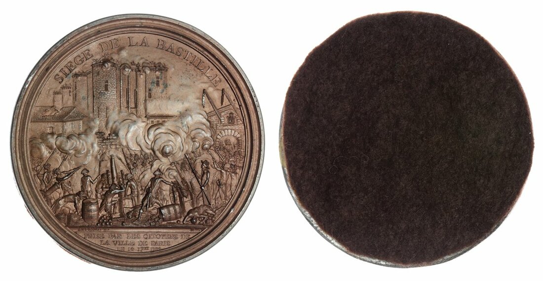France, Siege of the Bastille, 1789, bronzed AE medal, uniface, by B. Andrieu, SIEGE DE LA BASTILLE, battle scene at the Bastille, PRISE PAR LES CITOYENS DE LA VILLE DE PARIS LE 14 JUET 1789 in exergue in three lines, 86mm, 77.44g (Hennin 23)