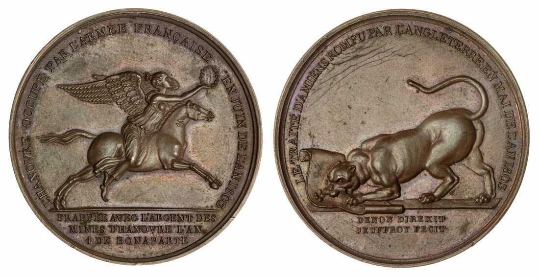 France, First Republic. Napoleon Bonaparte, as Premier Consul, Treaty of Amiens; The Occupation of Hanover June 1803, AE medal, 1803, by Denon, LE TRATTE D'AMIENS ROMPU PAR L'ANGLETERRE EN MAI DE L'AN 1803, Lioness crouching to left, mauling the Treaty of Amiens, rev. L'HANOVRE OCCUPE PAR L'ARMEE FRANCAISE EN JUIN DE L'AN 1803, Victory on horseback to right, holding wreath in outstretched right hand, FRAPPEE AVEC L'ARGENT DES MINES D'HANOVRE L'AN 4 DE BONAPARTE in exergue, 40mm (BR 271)