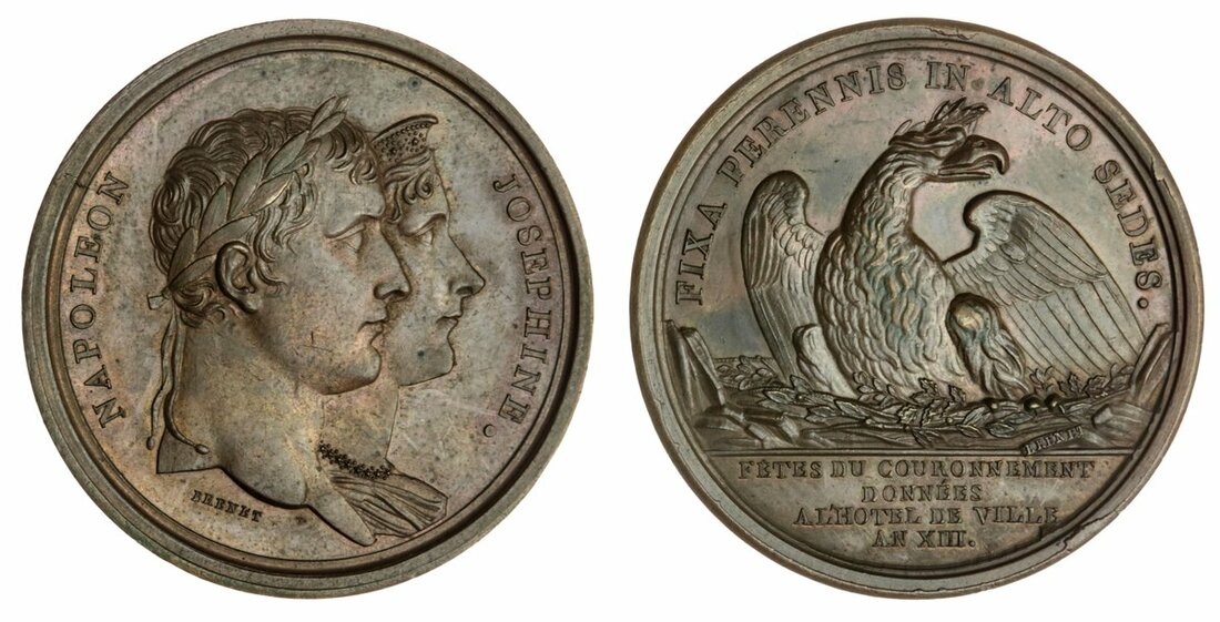 Napoleon and Josephine, Commemorating the coronation celebrations at Paris City Hall, 1804, AE medal, by Brenet, NAPOLEON JOSEPHINE, jugate busts of Napoléon, laureate, and Josephine, diademed and draped, bust right, rev. FIXA PERENNIO IN ALTOSEDES., laureate eagle standing to left in aerie, head to right, wings spread, FETES DU COURONNEMENT DONNÉES A L'HOTEL DE VILLE AN XIII in four lines in exergue, 35mm (Bramsen 359)