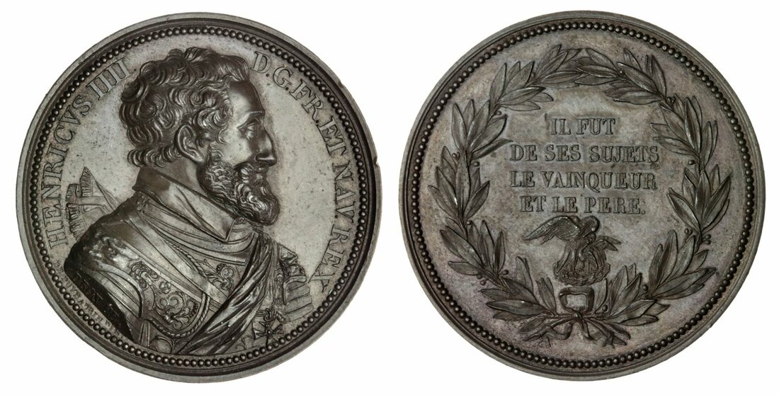 France, Henry IIII Bi-centenary of Death in 1610, AE medal, 1810, by J.P Droz, HENRICVS IIII D G FR ET NAV REX, armored and draped bust right, rev. within wreath and above pelican feeding young in nest, IL FUT DE SES SUJETS LE VAINQUEUR ET LE PERE in exergue, 40mm