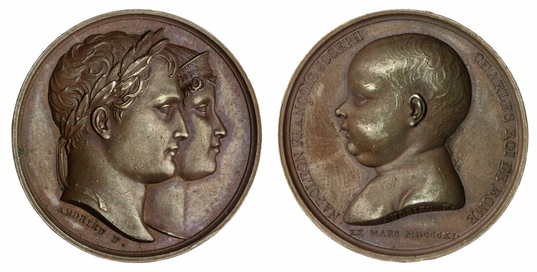 Napoleon and Josephine, On The Birth of Their Son, 1811, AE medal, by Andrieu, conjoined busts of Napoleon and Josephine right, rev. NAPOLEON FRANCOIS JOSEPH CHARLES ROI DE ROME, bust left, below XX MARS MDCCCXI, 35mm