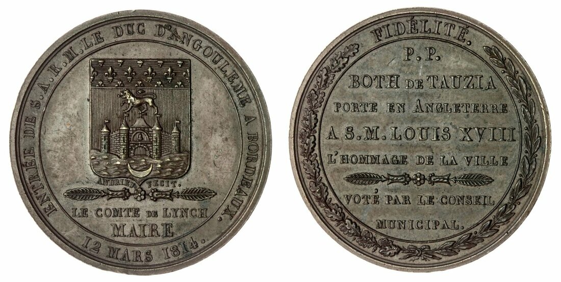 Entry of the Duke of Angoulême into Bordeaux, 1814, AE medal, by Andrieu, ENTREE DE S.A.R.M.LE DUC D'ANGOULEME A BORDEAUX 12 MARS 1814, Shield with the arms of the city of Bordeau, below LE COMTE DE LYNCH MAIRE, rev. FIDELITE, within laurel P.P BOTH DE TAUZIA PORTE EN ANGLETERRE A S. M. LOUIS XVIII L'HOMAGE DE LA VILLE VOTE PAR LE CONSEIL MUNICIPAL, 40mm