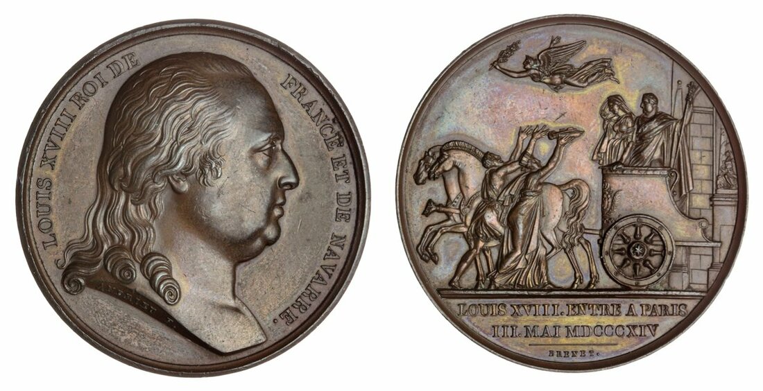 Entry of Louis XVIII de Bourbon into Paris, 1814, AE medal, by Andrieu, LOUIS XVIII ROI DE FRANCEET DE NAVARRE, bust right, rev. Arrival in chariot pulled by two horses, angel in sky, LOUIS XVIII ENTRE A PARIS III MAY MDCCCXIV in exergue, 41mm