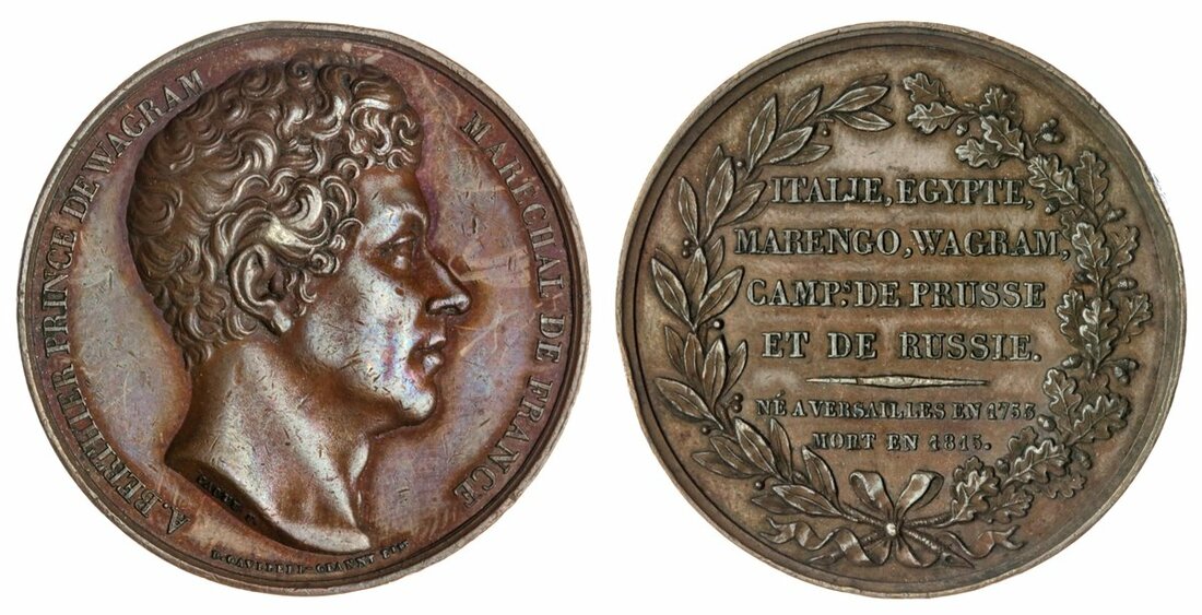 Prince De Wagram, Marshal of France, Commemoration of Death,1815, AE medal, by Caque, A. BERTHIER PRINCE DE WAGRAM MARECHAL DE FRANCE, bust right, rev. within laurel ITAIJE EGYPTE MARENGO, WAGRAM, CAMPS. DE PRUSSE ET DE RUSSIE. NE A VERSAILLES EN 1753 MORT EN 1815., 42mm