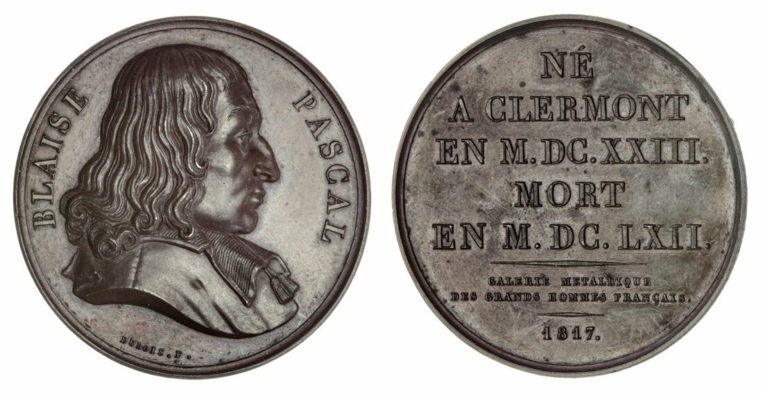 Blaise Pascal (1623-1622), Series of Great French Men, AE medal, 1817, by Dubois, BLAISE PASCAL, bust right, rev