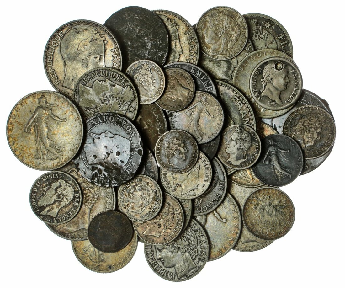 France, a collection of 19th and 20th century silver and copper coinage, incl. Charles X (1824-30), 2-Francs, 1828 W, Lille (KM 725.13), dark and patchy toning, very fine; the remaining coins varying greatly in conditions, averaging good fine. (30+