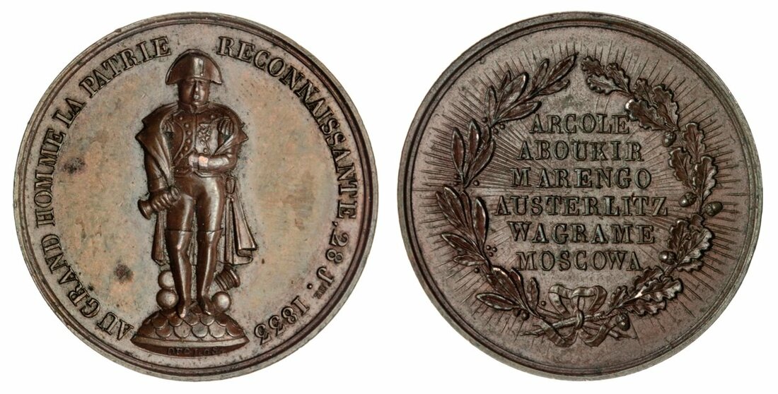 Napoloen Bonaparte, Commemoration of Six Victories, AE medal, 1833, by Duclos, AU GRAND HOMME LA PATRIE RECONNAISSANTE, 28 JTR. 1833, Napoleon standing in uniform, rev. within wreath ARCOLE ABOURIR MARENGO AUSTERLITZ WAGRAME MOSCOWA, 35mm