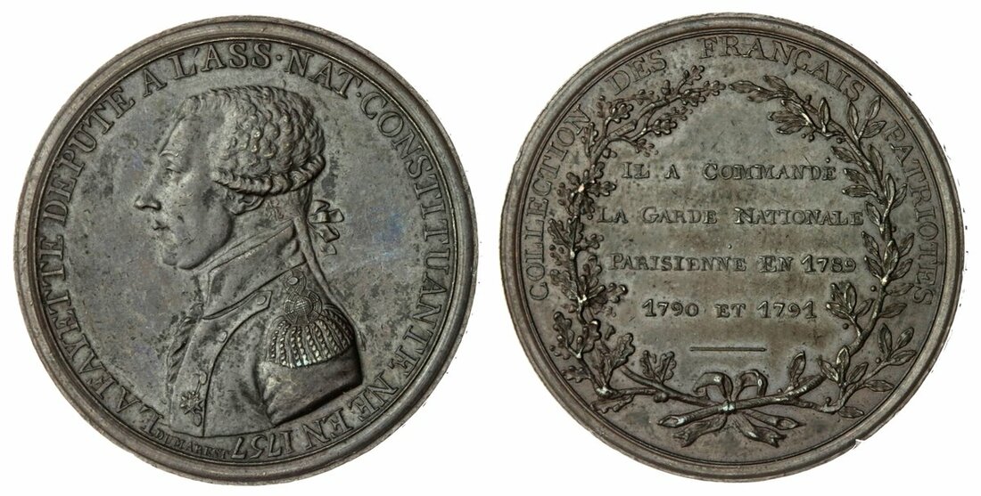 Marquis de Lafayette (1757-1834), Collection of French Patriots Series, AE medal, 1791, by Dumarest, LAFAYETTE DEPUTE A L'ASS. NAT. CONSTITUANTF NE EN 1757, uniformed bust left, rev. COLLECTION DES FRANCAIS PATRIOTES, within wreath IL A COMMANDE LA GARDE NATIONALE PARISIENNE EN 1789 1790 ET 1791, edged lettered, 35mm