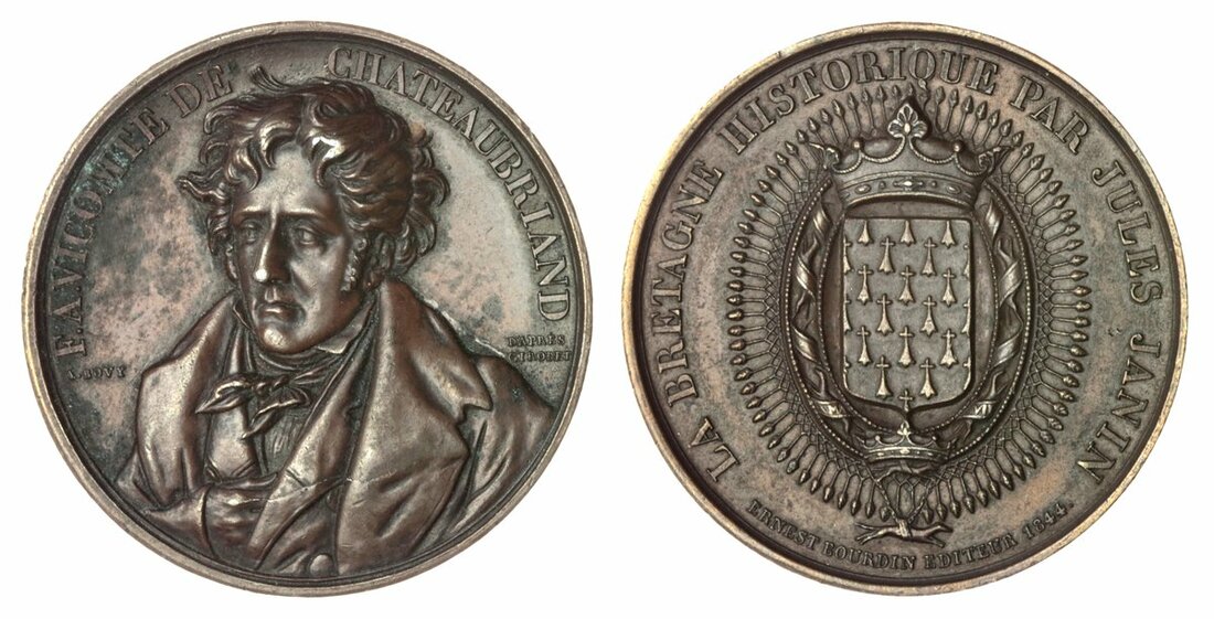 F.A. Vicomte De Chateaubriand, Historical Brittany by Jules Janin, AE medal, 1844, by A. Bovy and Girodet, F.A. VICOMENTE DE CHATEAUBRIAND, bust three-quarters left, rev. LA BRETAGNE HISTORIQUE PAR JULES JANIN, Crowned arms of Brittany, below L'ERNEST BOURDIN EDITEUR 1844., 41mm