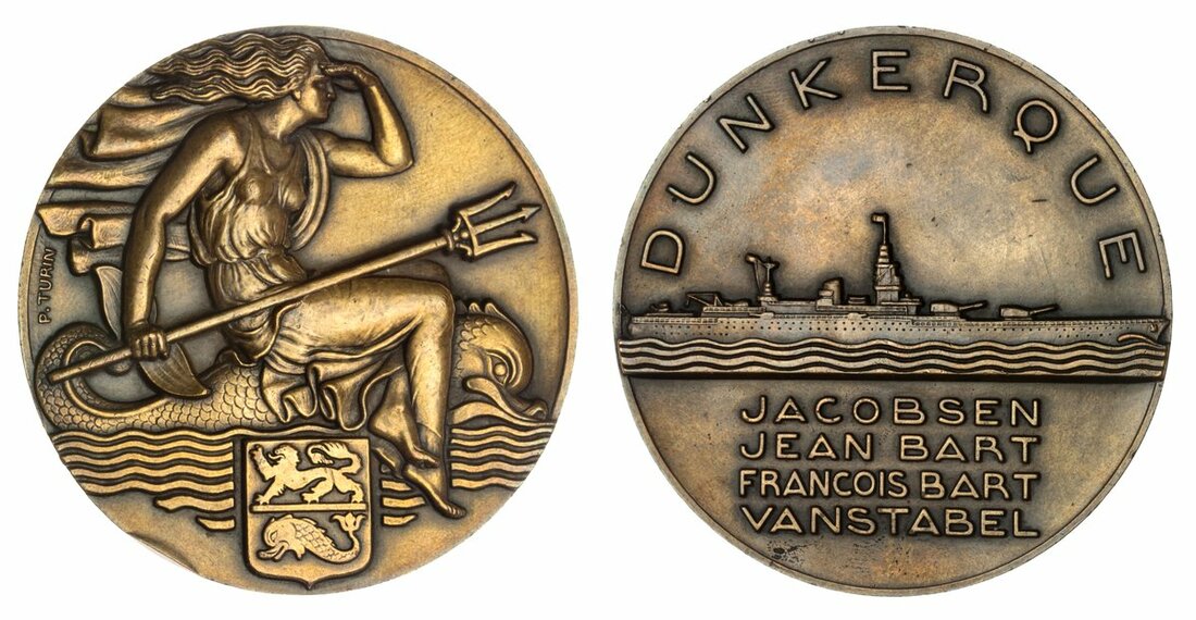 France, The Launching of the Battle Cruiser 'Dunkerque', 1935, AE medal, by P. Turin, Nereide riding doplhin, trident in hand, city arms below, rev. battle cruiser, name of admiral and captains below, 68mm, 159.58g, extremely fine with a couple of minor edge nicks