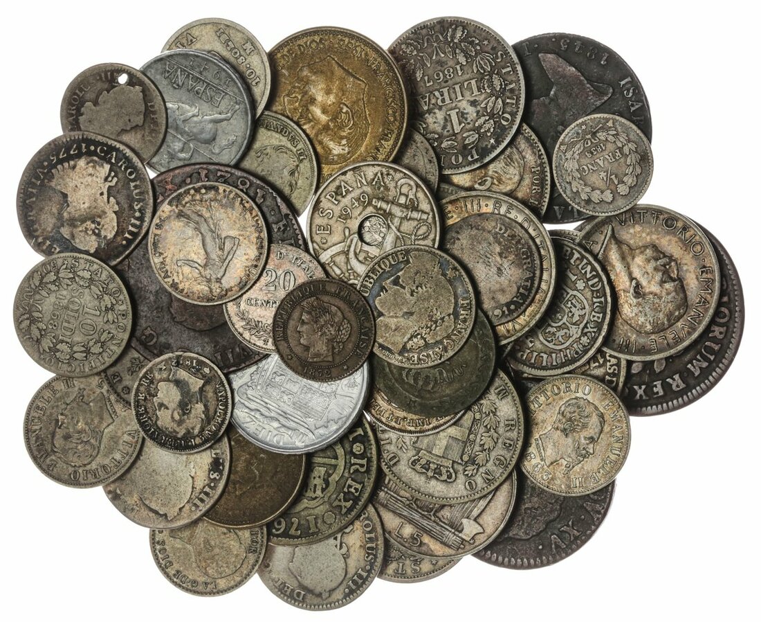France, Spain, Italy, Portugal, and Italy, a miscellany of 18th-20th century coinage incl. France, Louis XVI, 12 Sols, 1784A (KM 568.2); Portugal, John V (1706-1750), 5 Reis 1732 (KM 216); Spain, Charles III (1759-1788), 2 Reales, 1760, Madrid (KM 388.1); Isabel II (1833-1868), 8 Maravedis, 1845J (KM531.2), conditions ranging from about extremely fine to fair, a few perforated, an interesting and varied group. (40+)