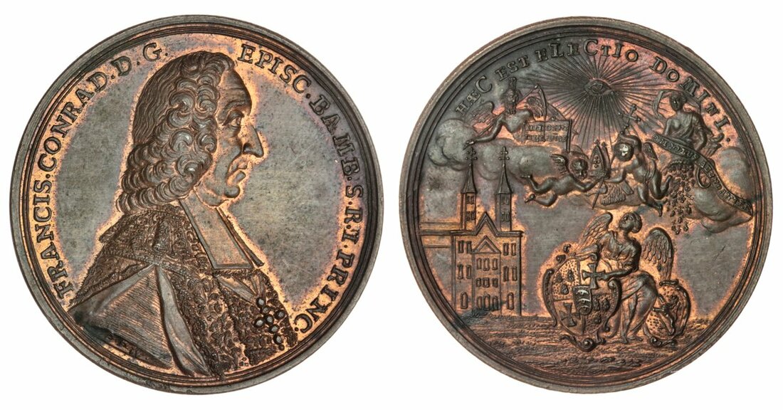 Germany, Bamberg, Francis Conrad On His Election as Bishop, 1753, AE medal, by Peter Paul Werner, FRANCIS. CONRAD. D.G. EPISC. BAMB. S.R.I. PRINC., bust right, rev. HAEC EST ELECTIO DOMINI, Angel holding family coat of arms in front of the cathedral, above Saturn, Abundantia and two putti with church insignia, 45mm (Heller 373)