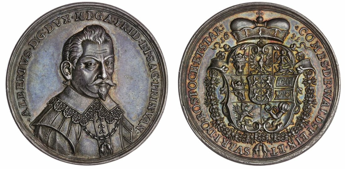 Emanuela Noheljlová-Prátová, in her 1969 standard work on Wallenstein coinage, pointed out the strange fact that "the great personality of Wallenstein was relatively very rarely depicted on medals". It could only prove four contemporary medals by the Wroclaw stamp cutter Hans Rieger and one by the Jitschin stamp cutter Konrad Freibösen. The author was only aware of one medal from the 18th century, namely the present work, probably from 1731 by the Viennese medalist Philipp Christoph Becker, who imitated Hans Rieger's portrait medal from 1631. Becker even left the year 1631 next to the ducal hat, in which he put his signature, and only changed the shape of the coat of arms.