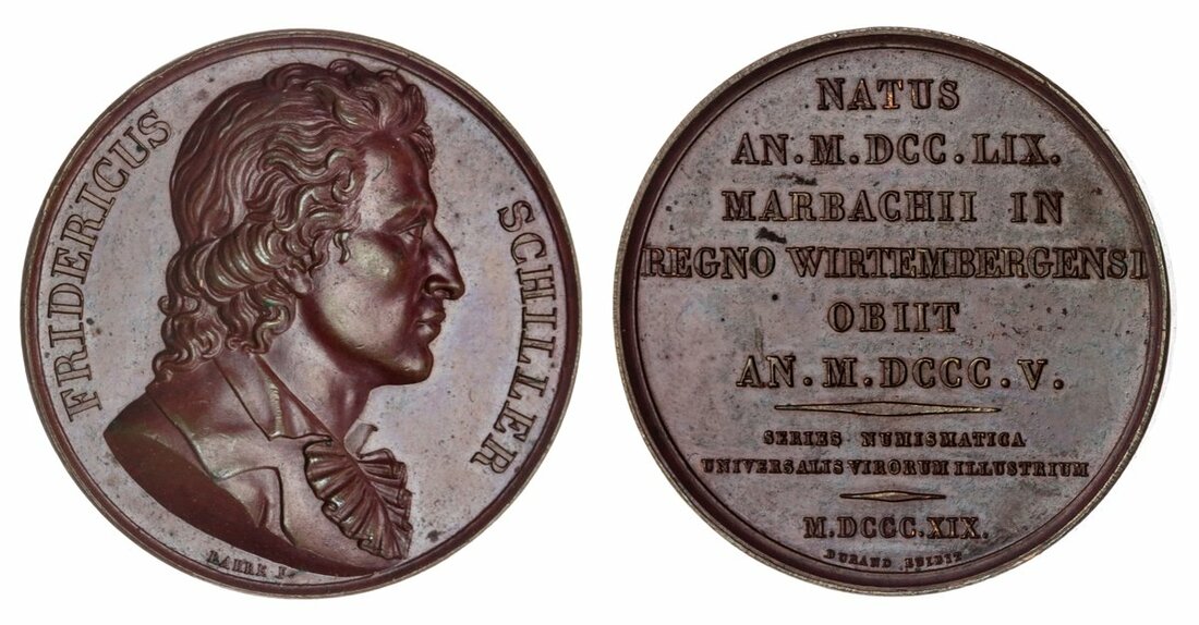 Fredrich Schiller (1759-1809), "Durand's Famous Men", AE medal, 1819, by Barre and Durand, FRIDERICUS SCHILLER, bust right, rev. Inscription, NATUS AN.M.DCC.LIX. MARBACHII IN REGNO WIRTEMBERGENSI OBIIT AN.M.DCCC.V. SERIES NUMISMATICA UNIVERSALIS VIRORUM ILLUSTRIUM M.DCCC.XIX., 41mm