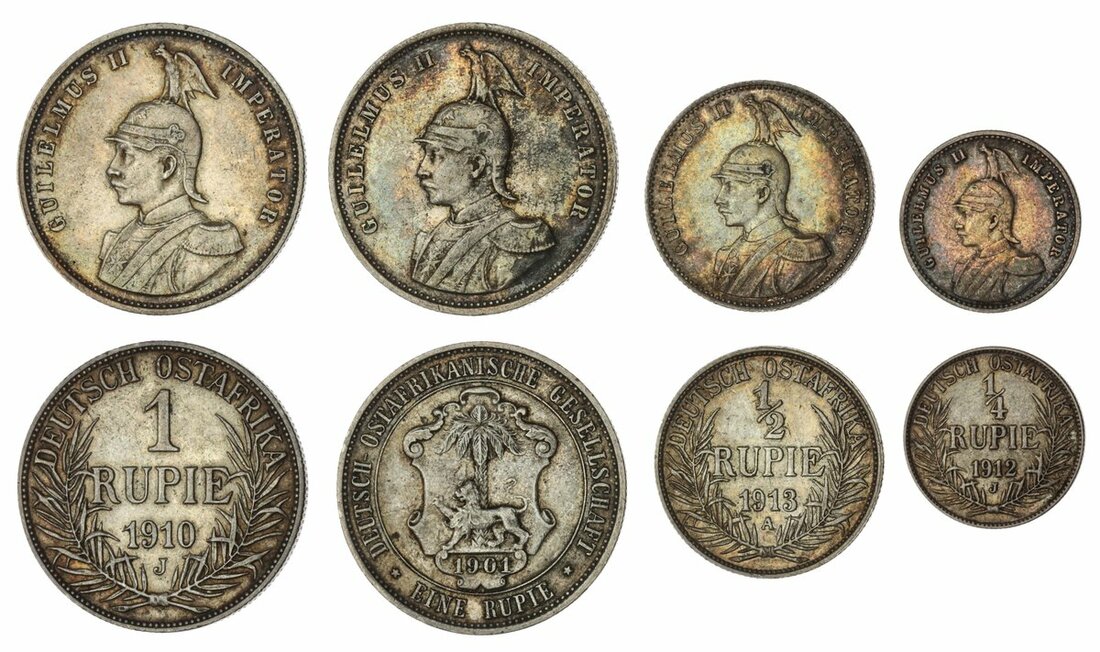 German East Africa, Wilhelm II (1888-1918), Rupies (2), 1901; 1910J (KM 2, 10), fine to almost very fine; additionally, ½-Rupie 1913 A (KM 9), lightly toned, very fine; lastly, ¼-Rupie 1912 J (KM 8), toned, fine; an interesting group (4)