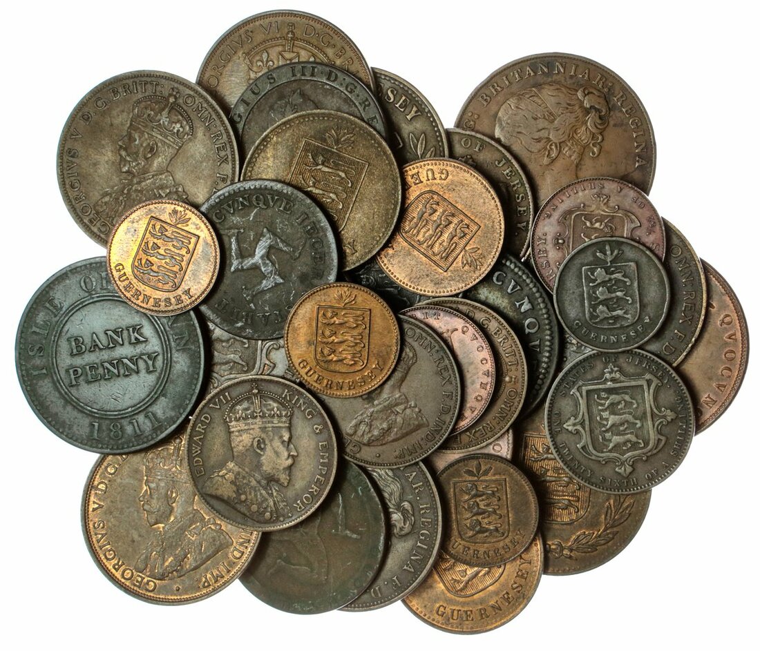 Channel Islands: Guernsey, 8-Doubles (3), 1834; 1868; 1918 (Spink 7200, 7206, 7214A), generally very fine; 4-Doubles (3), 1830; 1918; 1920 (Spink 7201, 7215A), very fine to much as struck; also, 2-Doubles, 1920 (Spink 7216A), about uncirculated; lastly, Doubles (4), 1830, no stop; 1885 H; 1933 (2) (Spink 7202, 7209, 7217A), very fine to mint state; additionally, Jersey, (13), 1/52-Shilling, 1841 over 0 (Spink 7003), good very fine, the overdate clear; also, 1/13-Shilling, 1858 (Spink 7001), fine; another, 1870, (Spink 7004), very fine; and, 1/26-Shilling, 1858 (Spink 7002), fine; another, 1866 (Spink 7005), fine; also, 1/12-Shilling, 1877 H (Spink 7006), good fine; another, Edward VII, 1/24-Shilling, 1909 (Spink 7010), fine; also, George V (5), 1/12-Shillings (3), 1913, 1923, 1933 (Spink 7011, 7015), very fine to extremely fine; also, 1/24-Shillings (2), 1923; 1926 (Spink 7014), both about very fine; and, George VI, 1/12-Shilling, 1947 (Spink 7017), extremely fine; lastly, Isle of Man (8), George III, First Issue, Penny, 1786 (Spink 7413), very fine; also, Bank Tokens (2), Penny, 1811; another, Halfpennies (2), 1811; 1831, fine; also, Halfpenny, 1798 (Spink 7416), fine; lastly, Victoria (3), Penny, Halfpenny and Farthing, 1839 (3) (Spink 7417, 7418, 7419), all with muted mint lustre, otherwise extremely fine, a most handsome 'Coronation' trio (32)