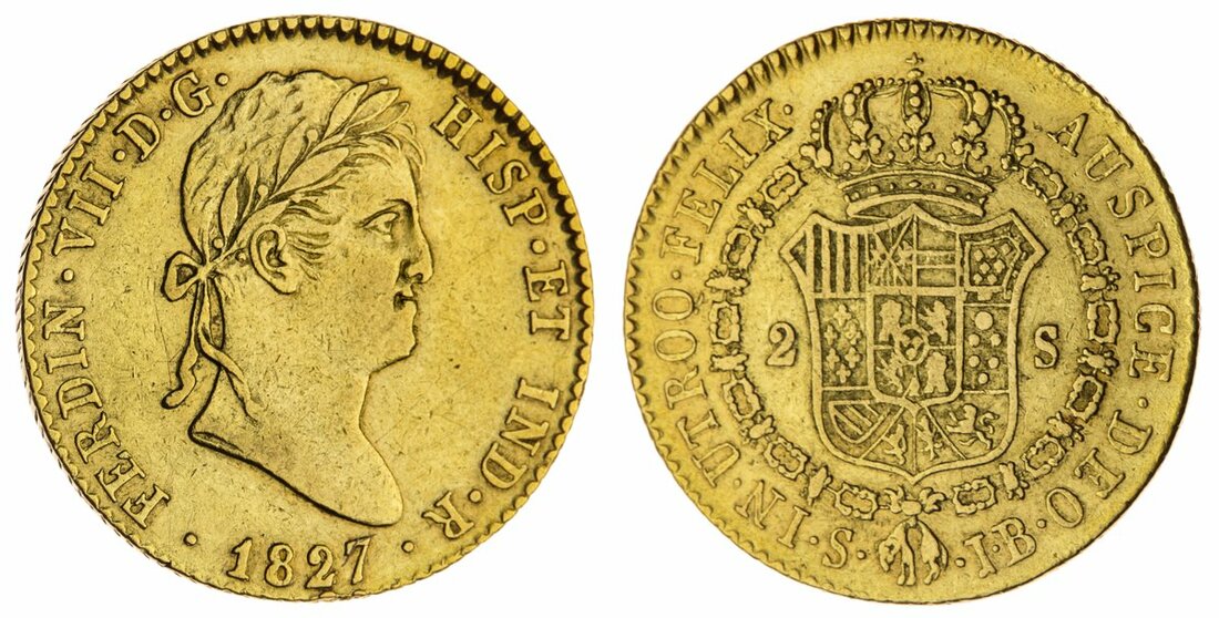 (g) The Trajan Collection | Spain, Ferdinand VII (1808-1833), 2-Escudos, 1827-S, Seville, edge obliquely milled, 6.72g, 11h (Cal. 271; Schlum. 258; KM 467; Cayon 16296), lightly cleaned, otherwise residually lustrous, very fine