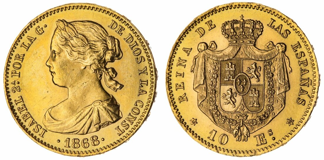 (g) The Trajan Collection | Spain, Isabel II (1833-1868), 10-Escudos, 1868, Madrid, edge lettered and starred, 8.39g, 12h (Cal. 815; Cayon 17407; Schlum. 267; Fb. 336; KM 636.1), lightly wiped and bagmarked, otherwise lustrous, about extremely fine