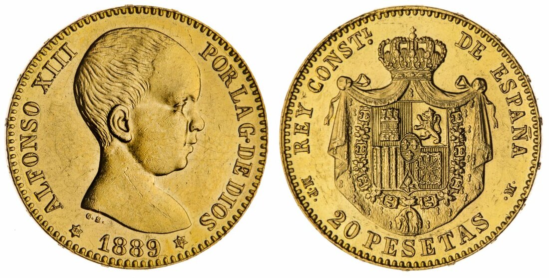 (g) The Trajan Collection | Spain, Alfonso XIII (1886-1931), 20-Pesetas, 1889 [1889 in stars], Madrid, edge starred, 6.43g, 6h (Cal. 113; Fb. 345; KM 693), lightly wiped, otherwise brilliant, about extremely fine
