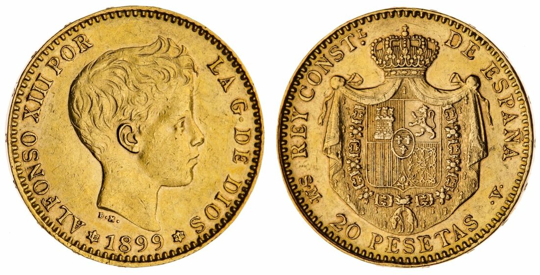 (g) The Trajan Collection | Spain, Alfonso XIII (1886-1931), 20-Pesetas, 1899 [1899 in stars], Madrid, edge starred, 6.44g, 6h (Cal. 116; Cayon 17654; Fb. 348), lightly wiped, otherwise lustrous, a bolder very fine