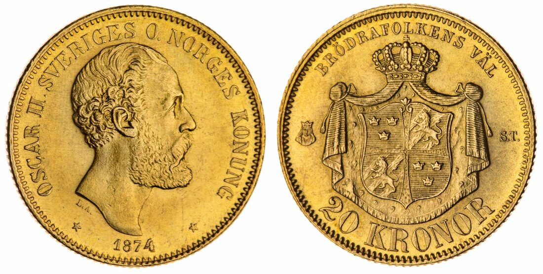 (g) The Trajan Collection | United Kingdom of Sweden and Norway, Oscar II (1872-1907), 20-Kronor, 1874 ST, 4 over lower 4, Stockholm, edge milled, 8.98g, 12h (Fb. 93; KM 733; Ahlström 2), bright and lustrous, practically mint state