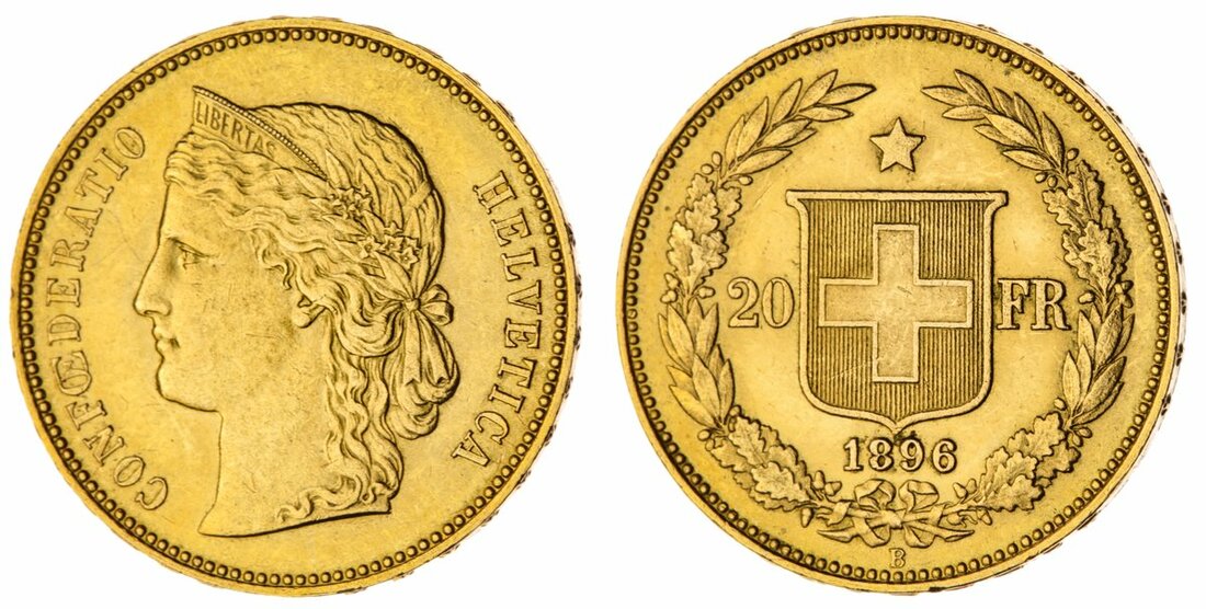 (g) The Trajan Collection | Switzerland, 20-Francs, 1896 B, Bern, edge milled, 6.46g, 6h (Fb. 495; KM 31.3), lightly wiped, otherwise lustrous, about extremely fine