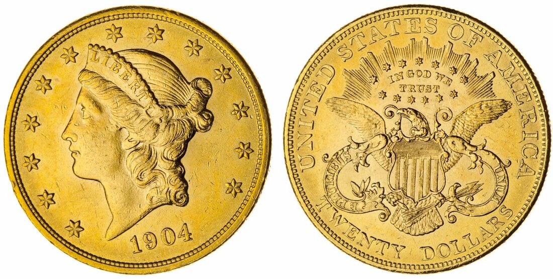(g) The Trajan Collection | United States of America, Double Eagle of $20 1904, Philadelphia, edge milled, 33.52g (PCGS #9045; NGC #26CY), bright with sporadic bagmarks in otherwise cartwheel lustrous fields, about extremely fine