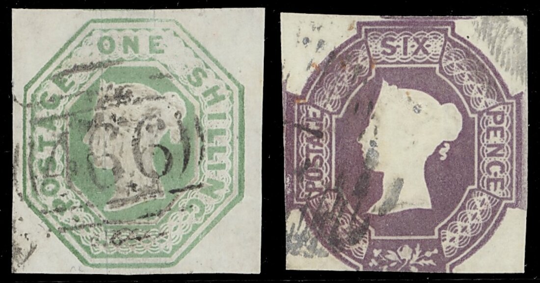 1/- pale green, good margins, cancelled with "466" duplex of Liverpool, a few peripheral imperfections and light soiling, and 6d. lilac, cut-square close to design in places and with indistinct cancellation; sound examples. Photo