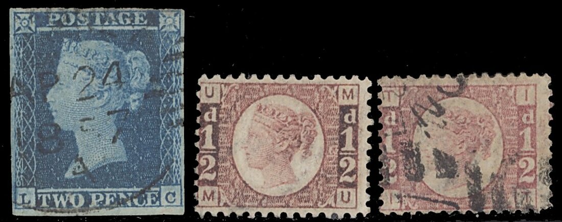 Plate 3, MU, unused, traces of gum; Plate 19, IT, used, watermark inverted, both centred to left. Also 1854-57 2d. with watermark inverted (perfs. trimmed). S.G. 48/49, etc.