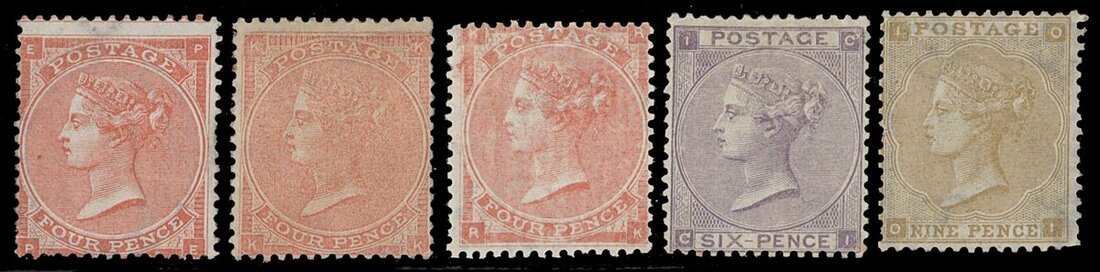 4d. red Plates 3 and 4 (2), 6d. and 9d., unused or mint; three with reperforated wing-margins, one 4d. toned, others of fresh appearance. (5)