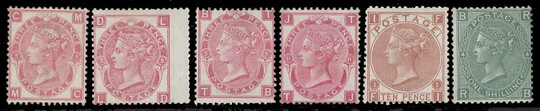 3d. Plates 5 (3) and 8, 10d. (reperfed wing-margin) and 1/- Plate 4, unused or with some gum and of reasonable appearance. (6)