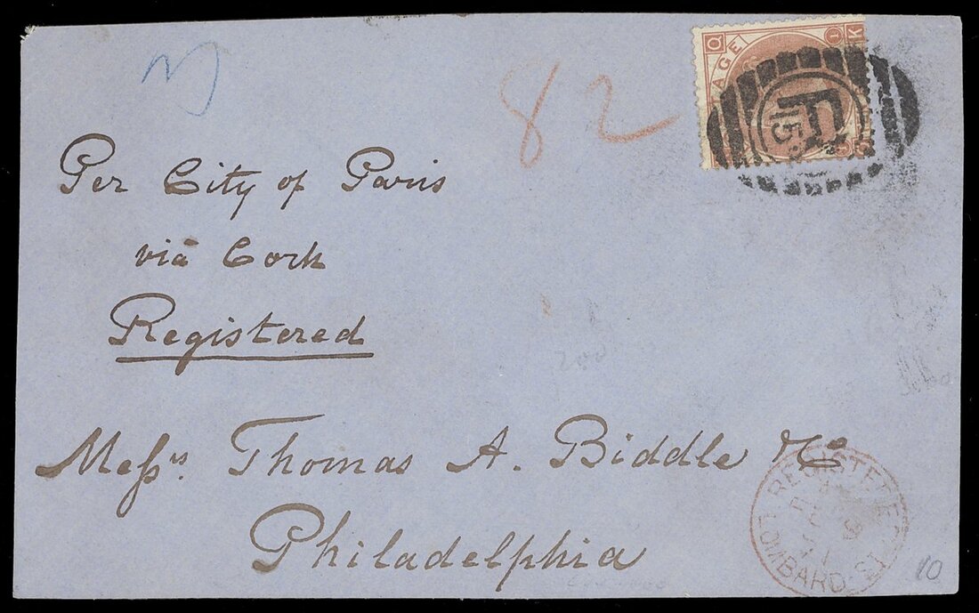 10d. red-brown, QK, tied by barred registered obliterator on cover front to Philadelphia ”Per City of Paris via Cork” with a neat 1871 (9 Feb.) Lombard Street registered c.d.s. in red