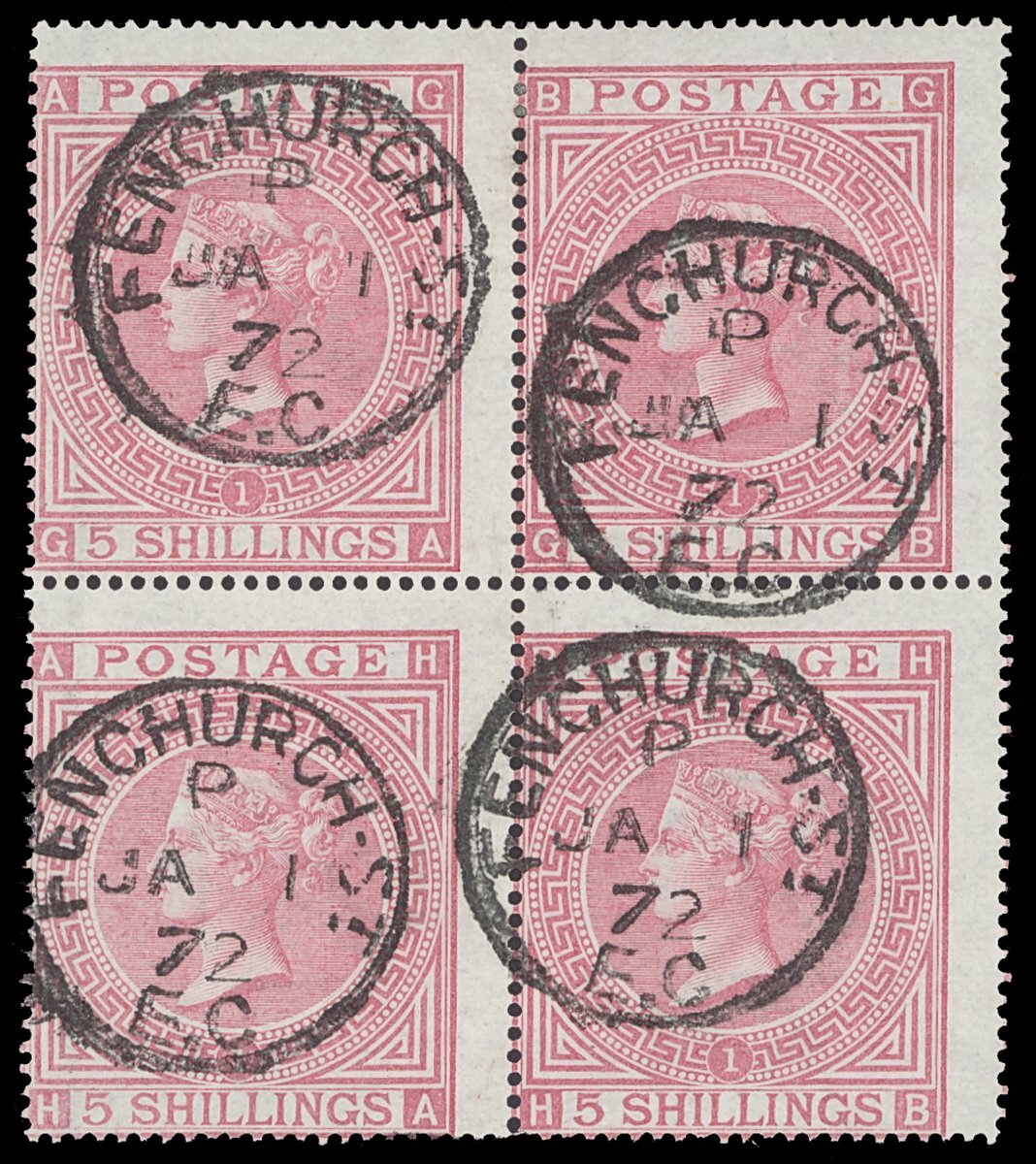 5/- rose Plate 1, GA-HB block of four cancelled by 1872 Fenchurch St. c.d.s., fresh and fine. A desirable multiple