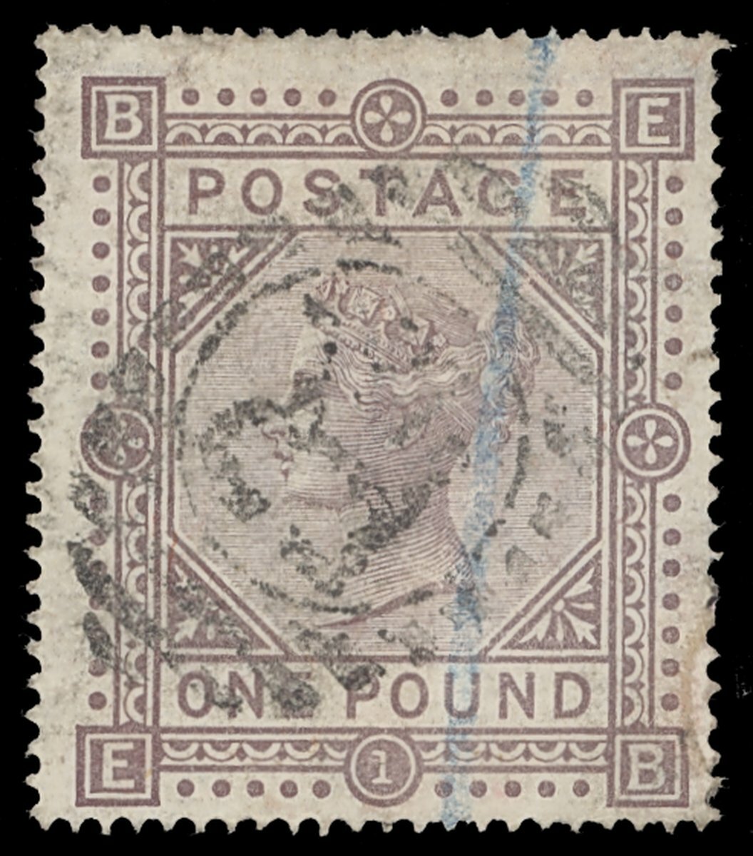 £1 brown-lilac, EB, cancelled by large registered “R” in barred oval, vertical blue crayon stroke; some repaired perfs. at right and a little tired. S.G. 129, £4,500