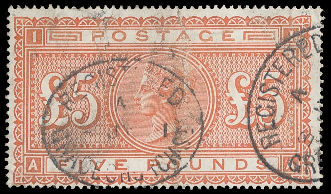 £5 orange, AA, cancelled by two registered oval handstamps; heavy surface abrasion and small creases. S.G. 137, £3,500