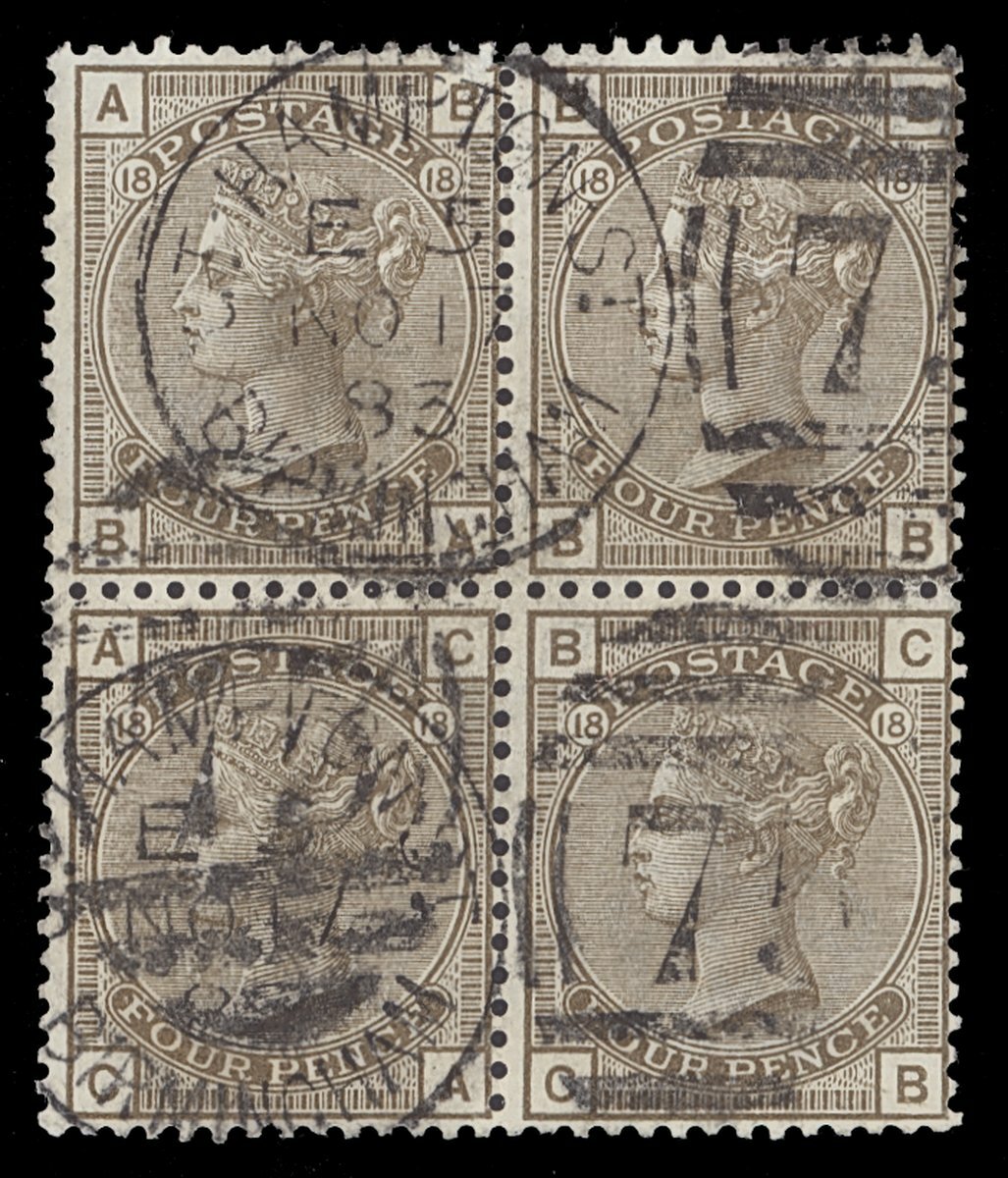 4d. grey-brown Plate 18, BA-CB block of four cancelled by Great Hamilton Street, Birmingham duplex; fresh. S.G. 160