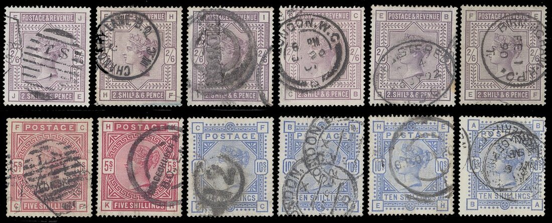 2/6d. (6), 5/- (2) and 10/- (4), various postmarks including c.d.s. and circular railway numeral; a few small imperfections though generally fair to good. (12)