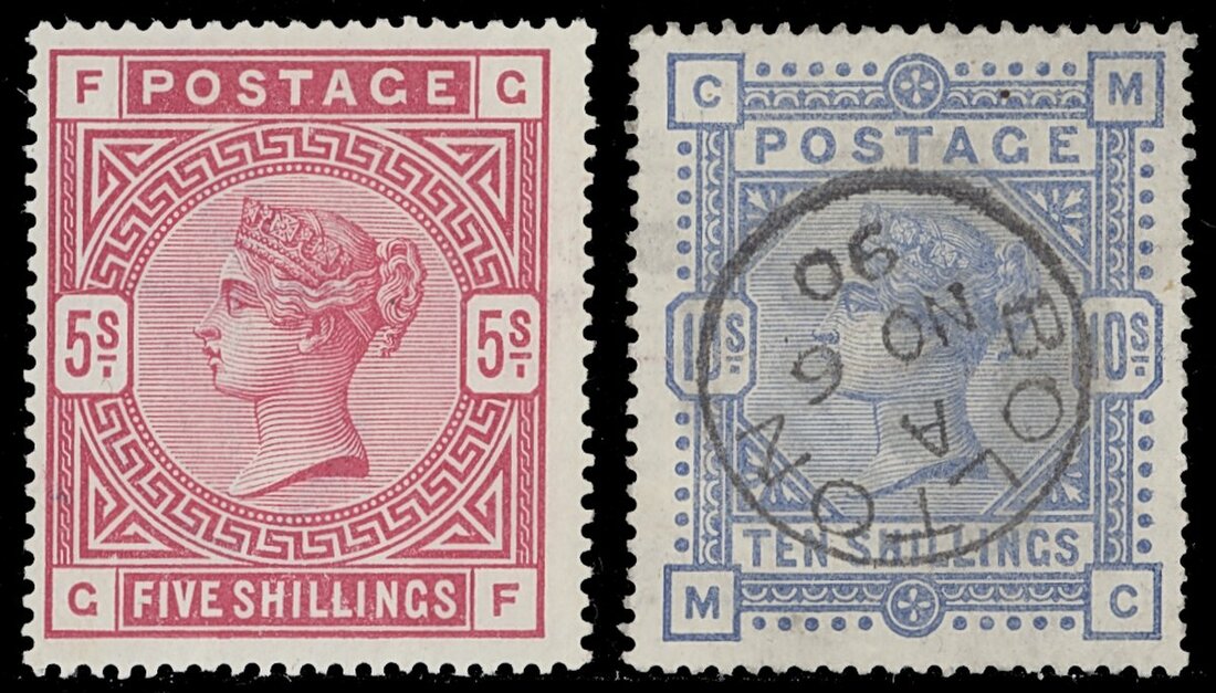 5/- crimson unmounted with full original gum (diagonal bend) and 10/- pale ultramarine cancelled by central '
