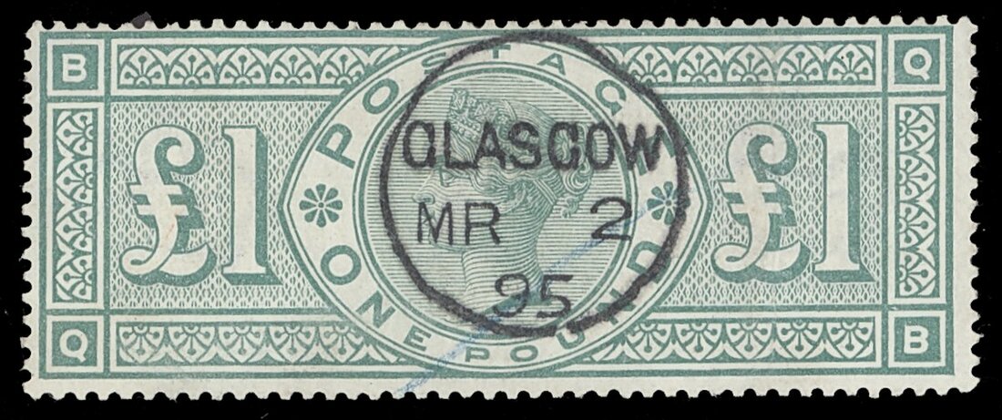 £1 green, QB, cancelled by a neat and central strike of 1895 Glasgow c.d.s.; light diagonal blue crayon mark and vertical crease