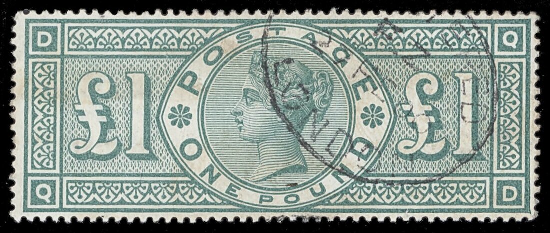 £1 green, QD, cancelled by a neat and light strike of London registered oval; some light marks on the face, otherwise fine. S.G. 212, £800