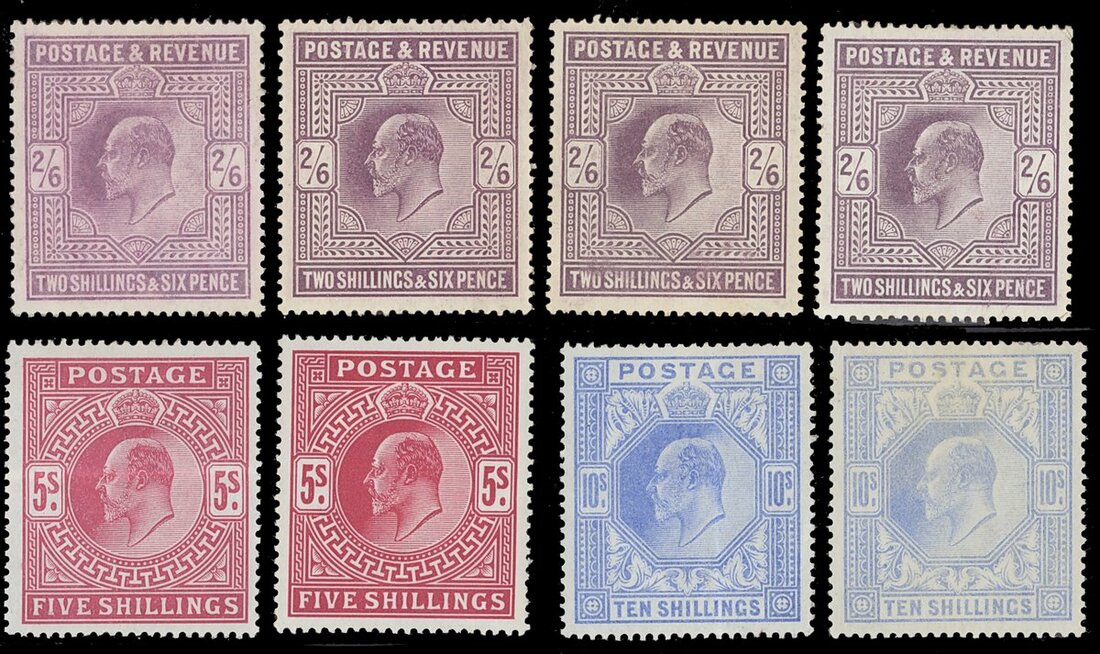 2/6d. (4), 5/- (2) and 10/- (2), unused to large part original gum; 2/6d. with age or other faults, 5/- are creased (one heavily) and 10/- are creased or faded. (8)